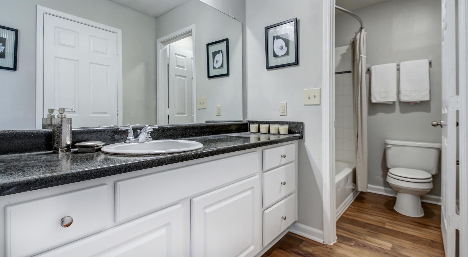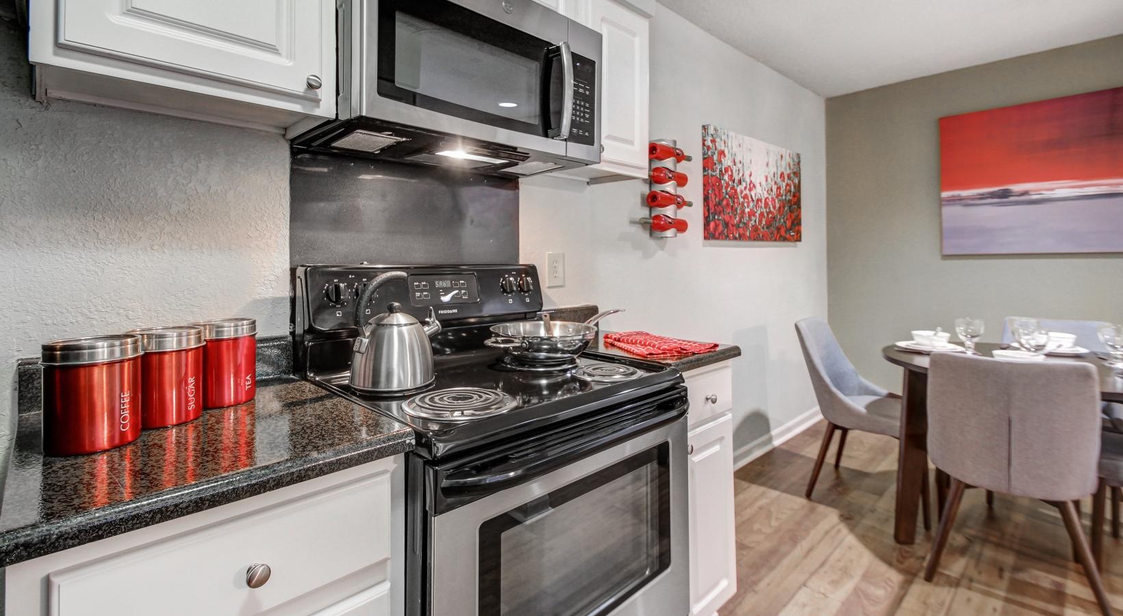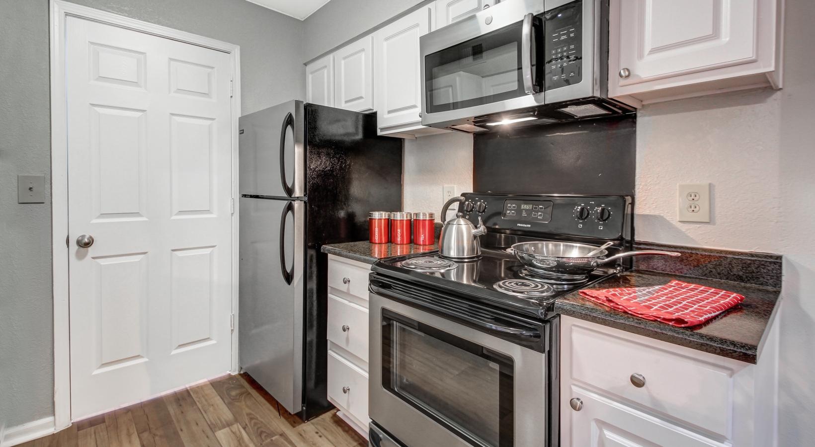 Living room with fireplace and balcony access Living room with an open concept layout Living room with an open concept layout Dining area next to open kitchen Dining area next to open kitchen Kitchen with black countertops and stainless steel appliances a kitchen with a stove and oven a kitchen with stainless steel appliances a kitchen with white cabinets Bedroom with lots of natural light Bedroom with lots of natural light and bathroom access Bathroom with tub/shower combo Large walk-in-closet in bathroom Bedroom with lots of natural light Bathroom with tub/shower combo Bathroom with large vanity