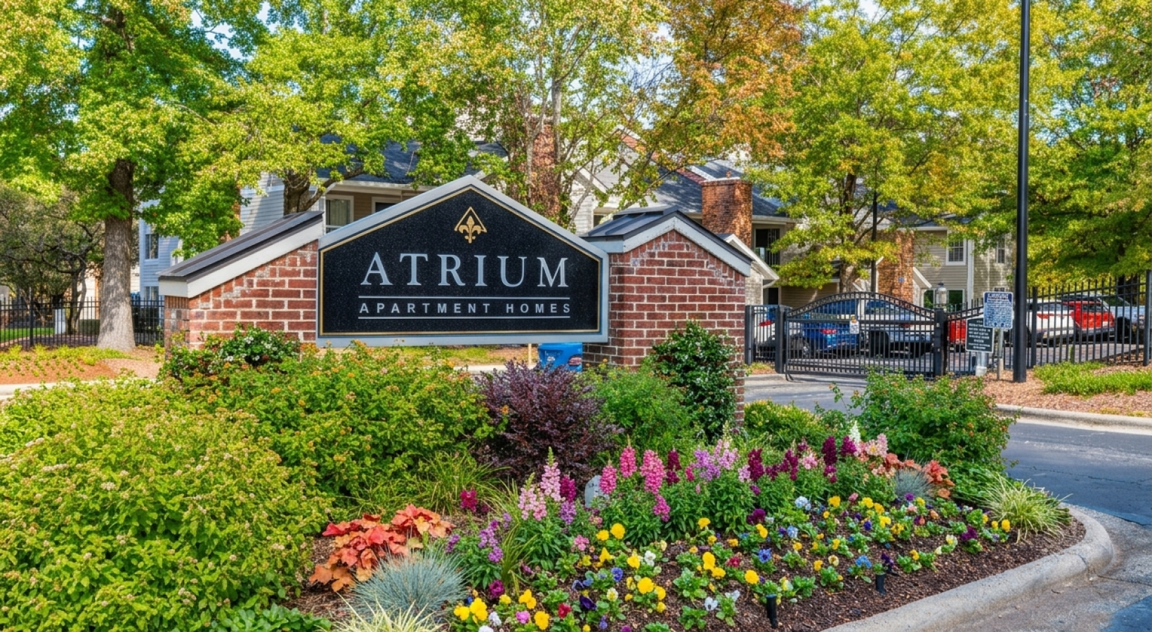 Two-story apartment buildings situated on beautifully landscaped grounds Sparkling pool and lounge chairs Sparkling pool and lounge chairs Sparkling pool and lounge chairs Poolside seating with umbrellas Playground with slides and climbing equipment Fitness center with cardio machines and weights Fitness center with cardio machines and weights Resident clubhouse with wood floors and lounge seating Resident clubhouse with wood floors and lounge seating Resident clubhouse kitchen with barstools Atrium apartments exterior signs