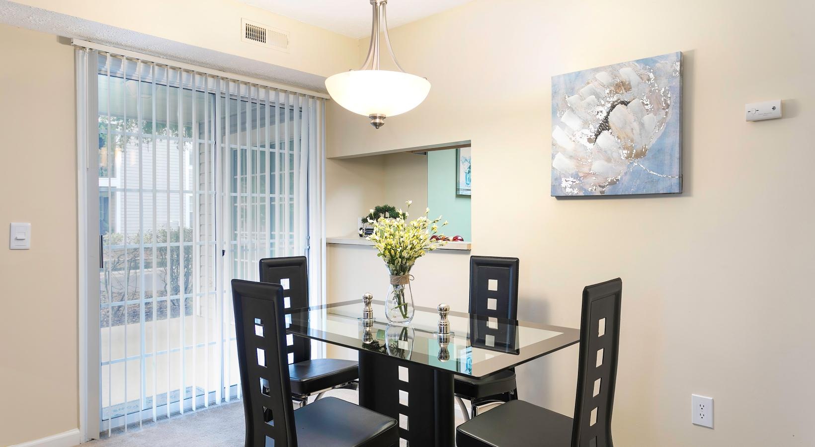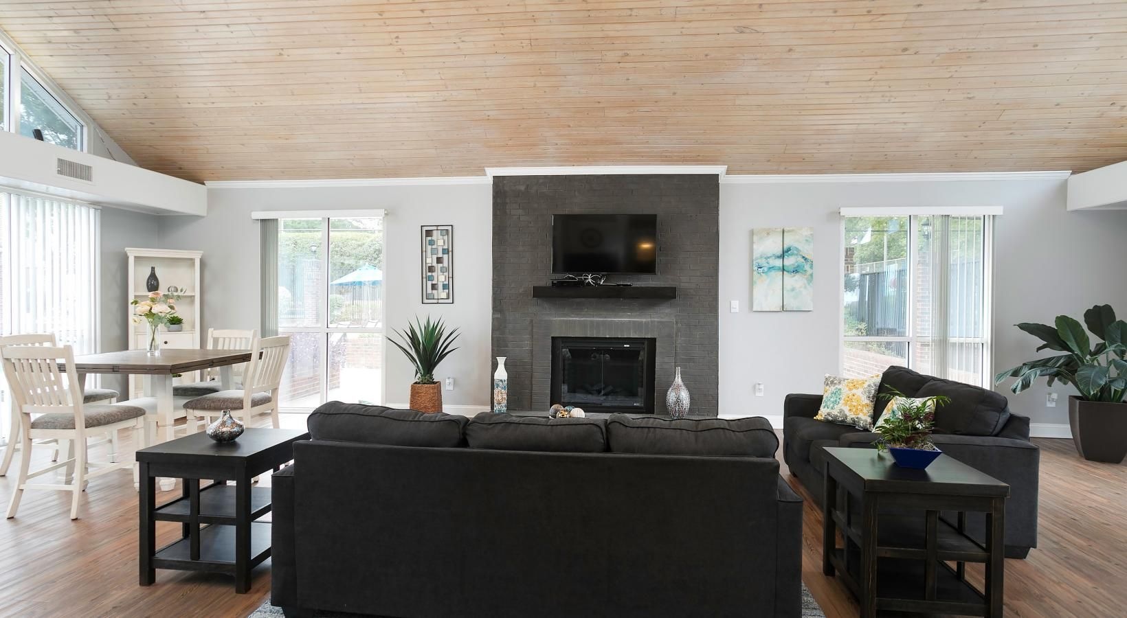 Spacious Living room with lots of natural light and fireplace Spacious Living room with lots of natural light and fireplace Spacious living room and dining area Dining area next to patio door Kitchen with a bar window opened up to living and dining spaces and black appliances Bedroom with a large window for natural light Large walk-in closets Spacious bathroom with dark cabinets Bedroom with patio/balcony access Large walk in closet Bathroom with full sized bathtubs