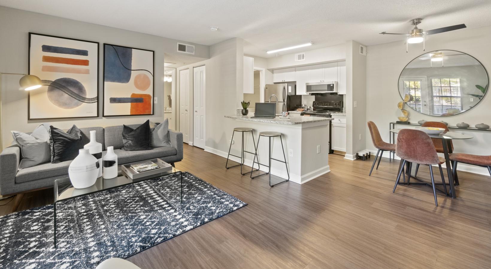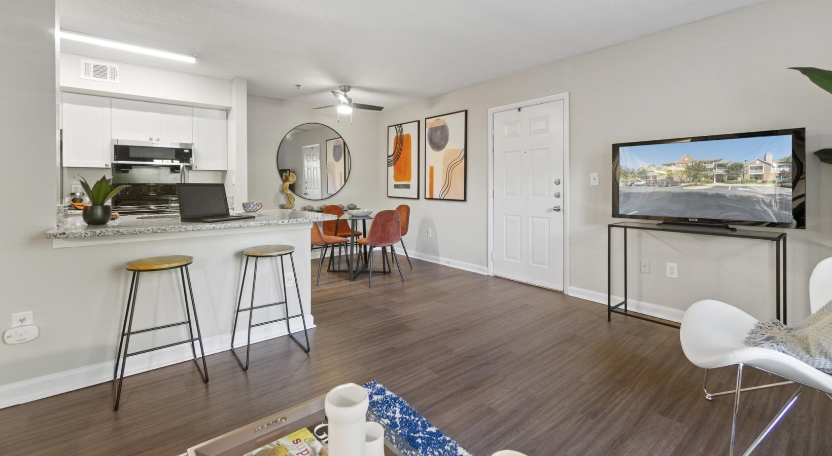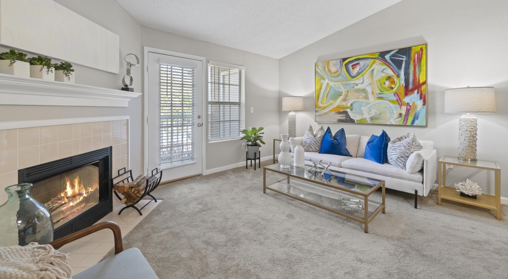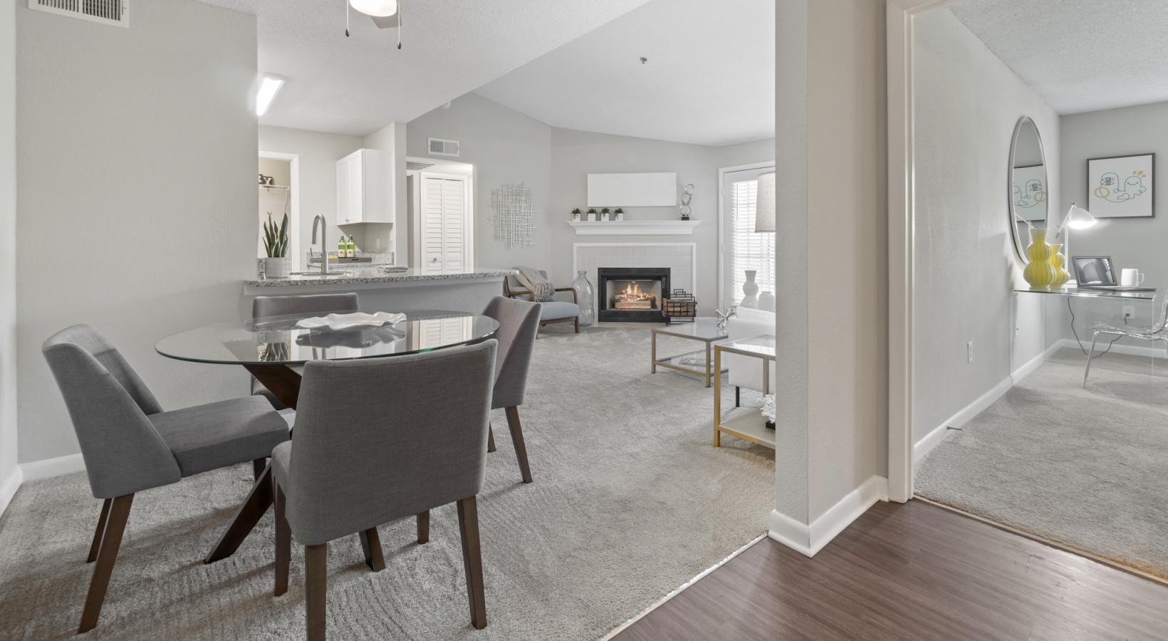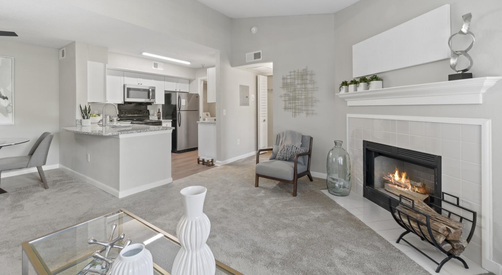 a living room with a fireplace and a breakfast island